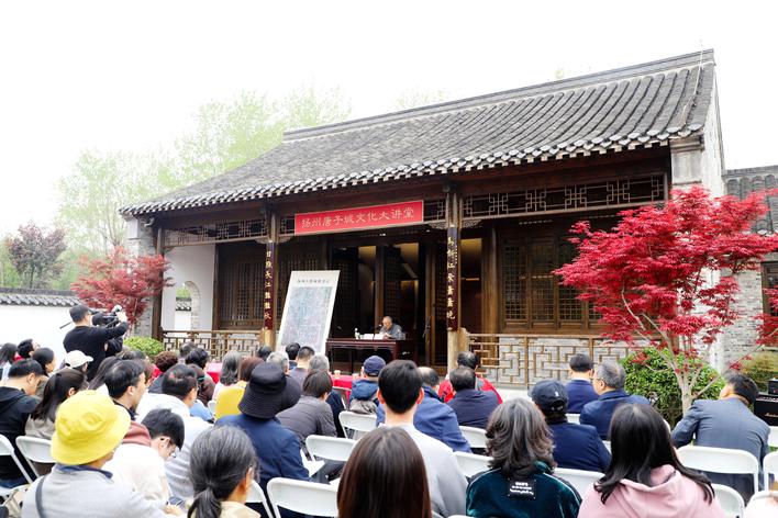 红枫掩映下的铁佛红枫文化体验区是集枫景展示、文化展览、文创售卖、禅茶疗愈于一体的休闲空间,该体验区依托五代十国吴王杨行密舍宅为寺所建的铁佛寺而打造。开园当天,园区举办了唐子城文化大讲堂,邀请江苏省文史馆员、扬州著名文史学者、顾风现场解读唐子城的前世今生,带领市民游客一起探寻遗址背后的故事。